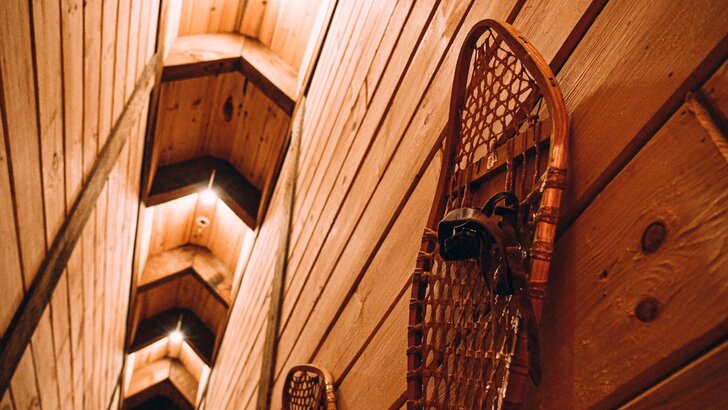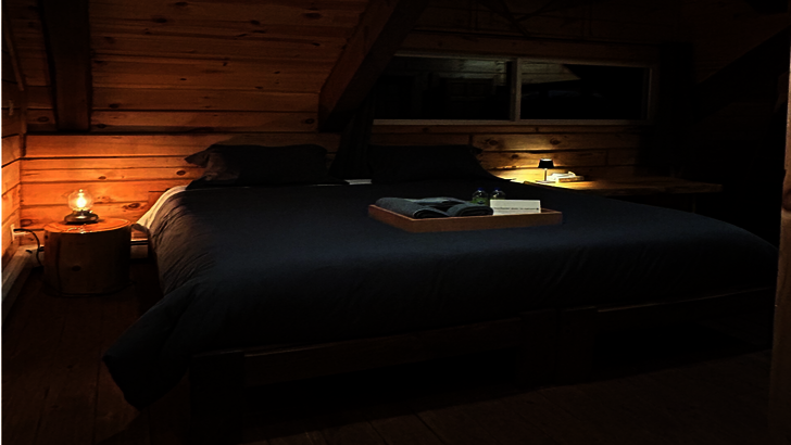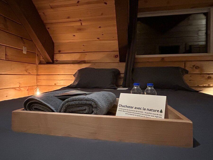 Nous posons nos bagages à l’Auberge Boréale, le bâtiment d’accueil du domaine. Située en plein cœur des montagnes de Charlevoix, l’immersion dans la nature est instantanée. Après les quelques heures de route pour se rendre à l’auberge, on prend possession de notre chambre pour aller se déposer un peu. On entre et tout de suite, l’odeur du bois omniprésente et le charme rustique imprègnent la pièce. Ça nous enveloppe dans une atmosphère super cozy pour notre nuitée.