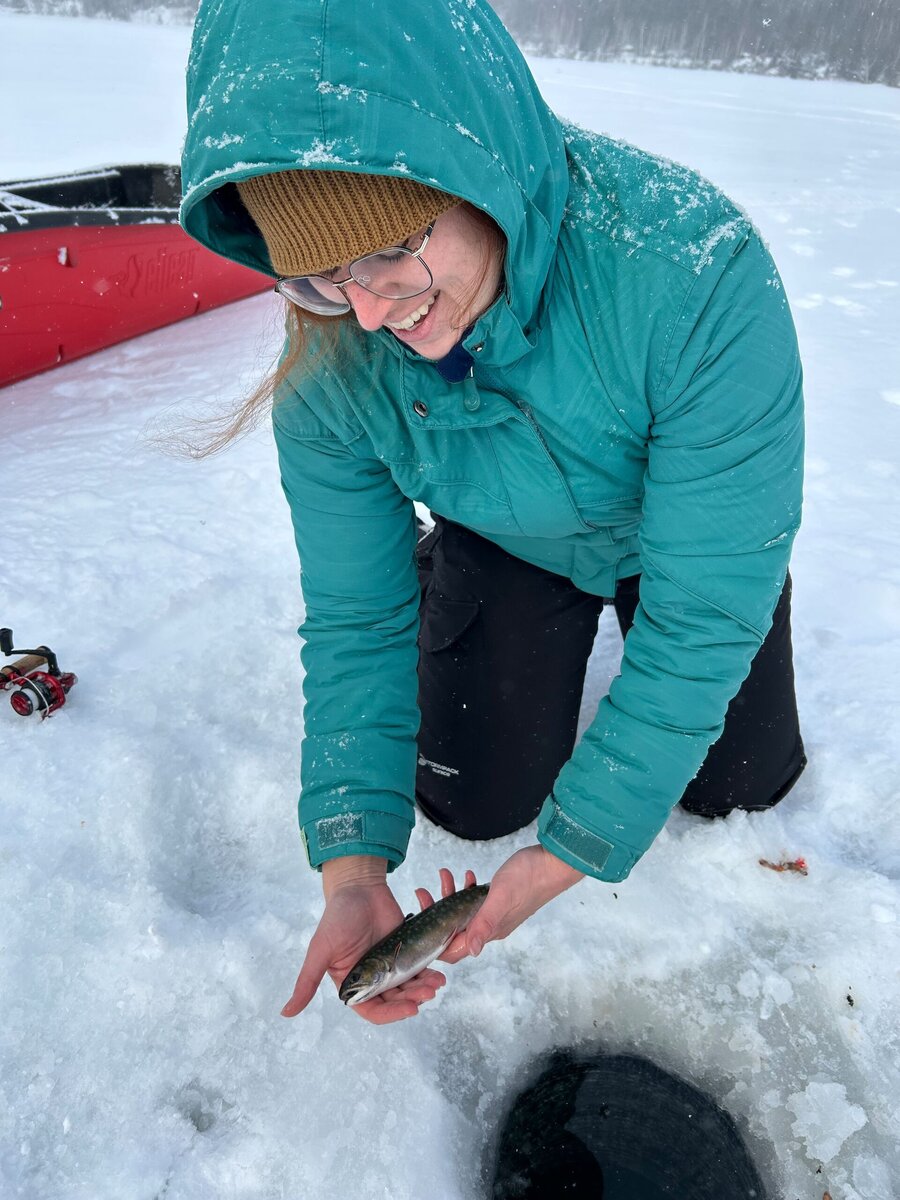 Une fois sortis du sentier, on arrive sur le lac Brouillard et on commence à préparer notre matériel pour notre initiation à la pêche sur glace. Mathieu, notre guide pour cette activité, nous explique les étapes de base pour bien profiter de l’activité et tenter d’obtenir une prise. Une fois installées, c’est maintenant l’heure… d’être patientes. Je fais des blagues, mais comme on l’a appris, l’hiver les poissons sont moins réactifs. Il faut donc jouer au jeu de l’attente, mais entre vous et moi, ça fait partie du plaisir de s’adonner à cette activité. Notre prise, il faut la gagner ! Après 45 minutes, nous finissons par attraper deux truites, à quelques minutes d’intervalle ! Pas si mal pour des novices ! Nos prises sont ensuite remises à l’eau.