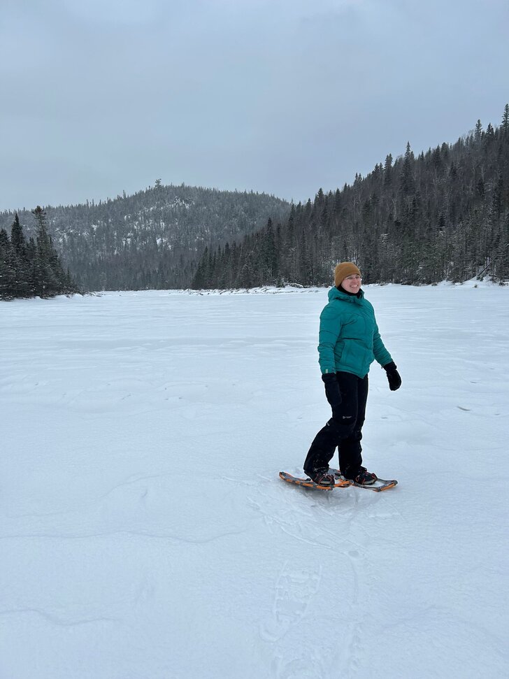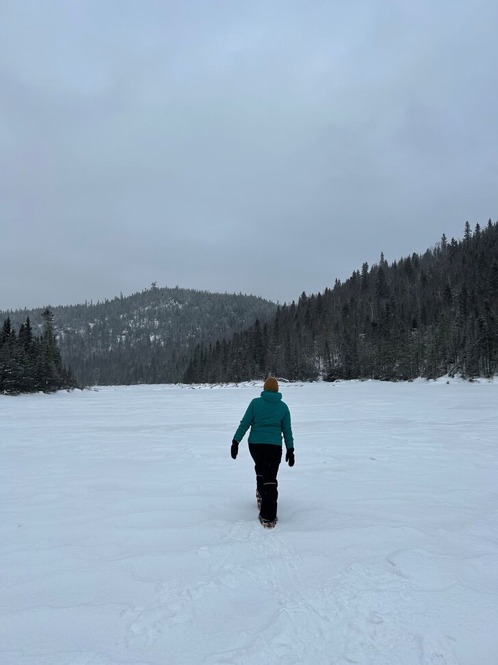 Pour le retour à l’auberge, on décide de profiter de la température douce pour retourner à l’Auberge Boréale en raquette. Une balade apaisante dans un décor calme et enchanteur, quoi demander de mieux pour une randonnée ? Entourée par les montagnes à perte de vue sur un lac gelé, je suis forcée d’admettre que la vue était assez difficile à battre.