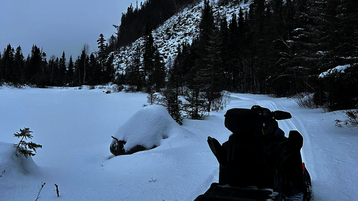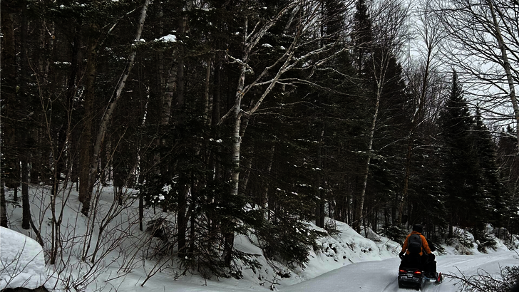 Bien que je sois native du Saguenay–Lac-Saint-Jean, je dois vous admettre que je n’ai jamais fait de motoneige… ni de pêche sur glace ! Avant qu’on me lance des roches, c’était l’un de mes buts avec ce petit voyage entre amies. On voulait commencer l’année en s’offrant de vraies expériences hivernales. On enfile donc nos vêtements chauds et nos habits de neige pour entamer la journée. On embarque sur les motoneiges, accompagnés de nos guides, qui agrémentent la balade d’un peu d’informations, anecdotes et d’interprétation sur le territoire du domaine.