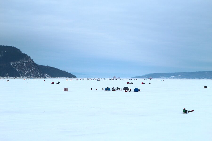 Il était maintenant temps pour nous d’aller dehors et de profiter de la température clémente. À peine sorties de l’auberge, nous voilà déjà sur le sentier aménagé qui longe la Baie et le fjord gelé. Plusieurs motoneigistes en profitaient également alors qu’ils se dirigeaient vers les différents sentiers à proximité. Pour notre part, nous apprécions la vue en allant voir quelques boutiques au centre-ville. Nous avons aussi terminé notre visite en allant du côté de la marina. Il était possible de voir les pêcheurs sur glace qui commençaient l’installation de leur tente pour le début de saison, à coup d’allers-retours de traineaux et de motoneige. Les températures douces ne permettaient pas encore l’installation des cabanes, mais le grand désert de glace qui s’étendait devant nous en valait malgré tout la peine.