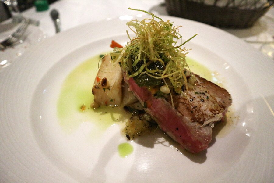 Personnellement, je savais que la première entrée tomberait dans ma palette : risotto crémeux, crevettes fraiches, vieux Cheddar Boivin et petite croustille pour offrir un peu de croquant dans les bouchées. Tout simplement délicieux! Pour le plat principal, nous nous sommes laissées tenter par les spécialités de la soirée. Pour mon amie, assiette de cerf rouge avec sauce aux poires et légumes croquants. De mon côté, j’ai opté pour le thon snacké accompagné de sa salsa d’ananas et poivrons. L’accord des viandes, de leur sauce et des accompagnements est très recherché et crée un univers de saveurs incroyable. Les portions sont également très bien dosées pour permettre de savourer chaque plat et de se laisser de la place pour le prochain service.