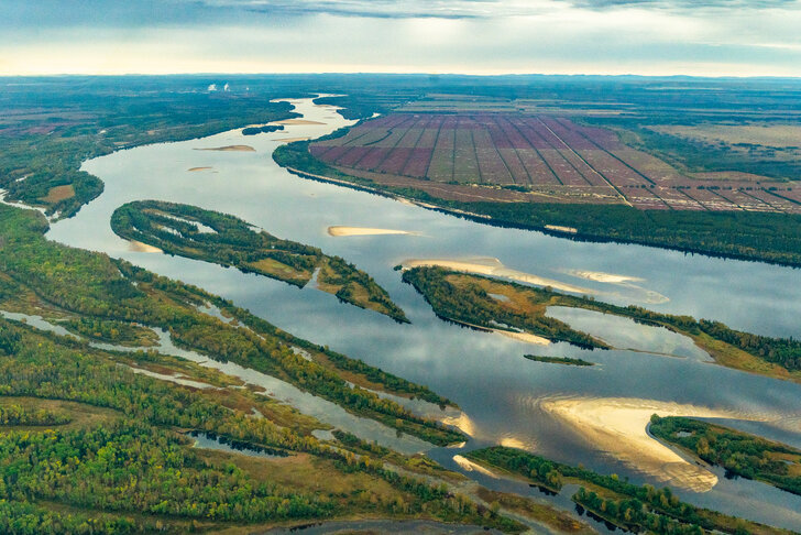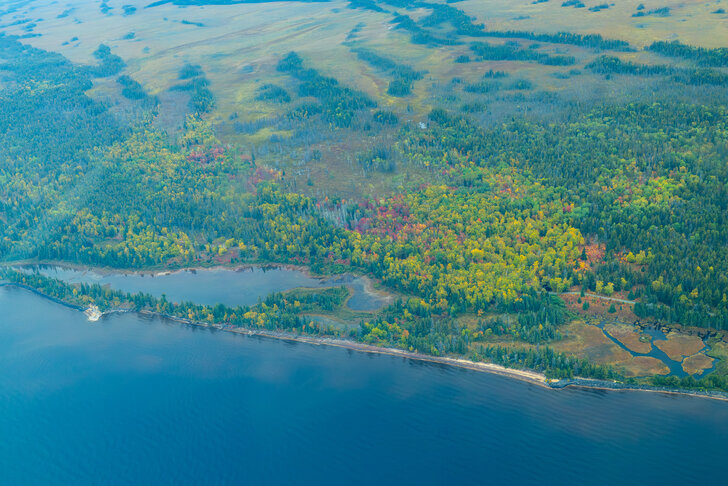 Depuis le hublot, le territoire se déploie dans toute son ampleur. Les rivières argentées dessinent des routes à travers les paysages, les villages se succèdent le long des champs de bleuets devenus rougeâtres et le majestueux Lac Saint-Jean, immense et calme, s’étend jusqu’à la ligne d’horizon.