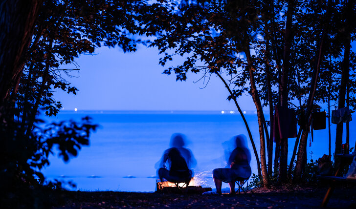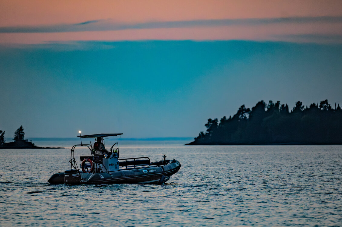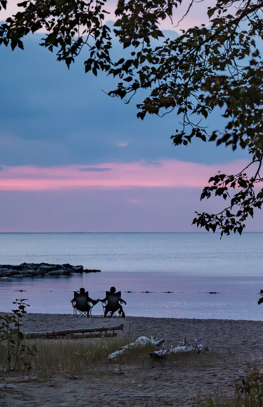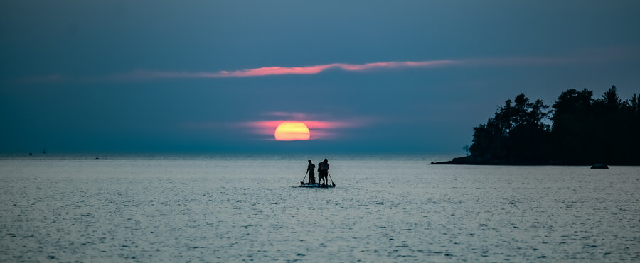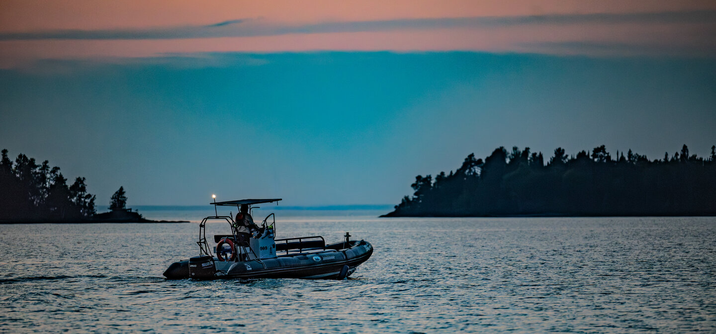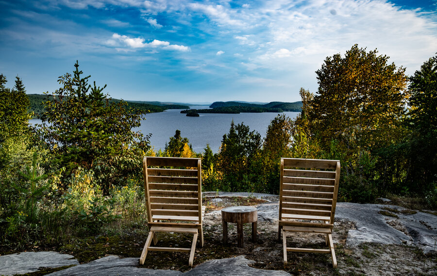 Je suis arrivé tôt parce que je connaissais déjà les lieux et mon but était de mettre mon kayak à l’eau pour explorer le chapelet d’îles. Pagayer, accoster, plonger dans le lac, repartir… et recommencer. Au Camp de Touage, le soir les campeurs se rassemblent sur la plage pour voir les plus beaux couchers de soleil de la région.