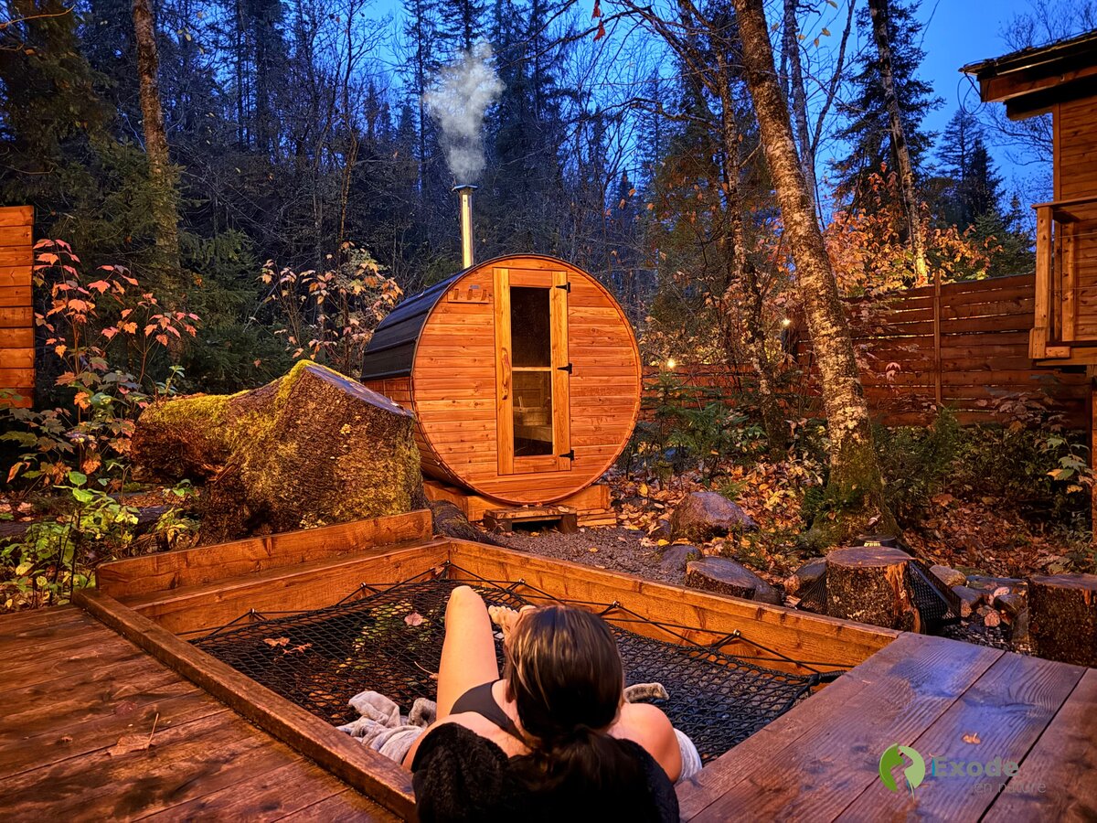 Exode en Nature offre désormais une expérience de bien-être incomparable : chacun de ses hébergements dispose de son propre sauna privé, en plus du bain nordique chauffé au bois et de l’accès exclusif à la rivière. Cette nouveauté permet de profiter d’un véritable spa scandinave privé, combinant chaleur, eau froide et détente, en toutes saisons. Pour un confort optimal, chaque site est également équipé d’une thermopompe avec climatisation, garantissant une expérience agréable en toute période de l’année. Une occasion unique de se ressourcer au cœur de la nature, dans un cadre chaleureux et relaxant.