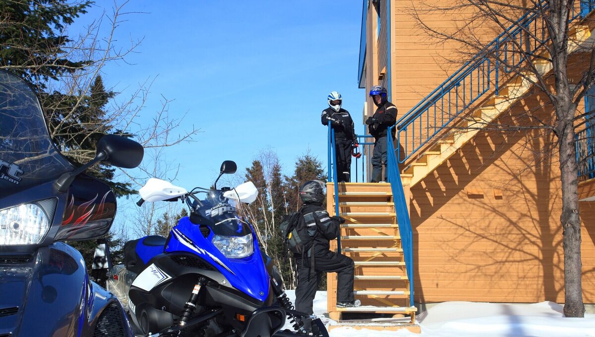Accès direct en motoneige et stationnements devant les unités, équipés de câbles pour motoneige, idéal pour groupes ou famille.