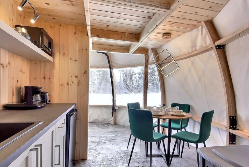 L’expérience hivernale 100 % nature, luxe rustique, spa, motoneige, pêche blanche et souper maison.